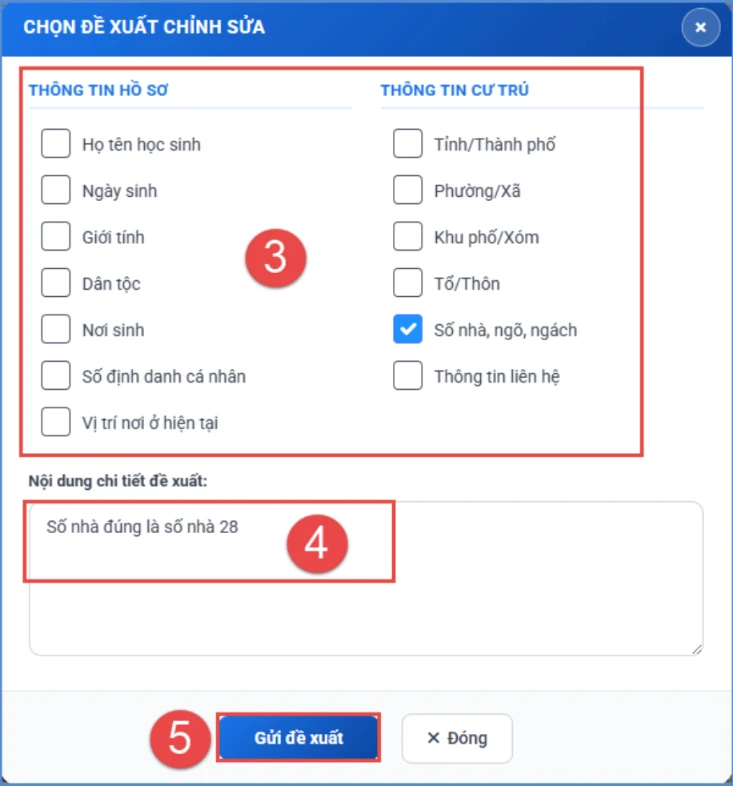 Trường hợp có thông tin cần điều chỉnh, phụ huynh tải lên hình ảnh giấy khai sinh và thông tin cư trú trên VneID tại mục Thông tin minh chứng. Sau đó, phụ huynh kích nút Đề xuất chỉnh sửa để chọn thông tin chưa chính xác và nhập nội dung chi tiết đề xuất. Cuối cùng, kích nút Gửi đề xuất.