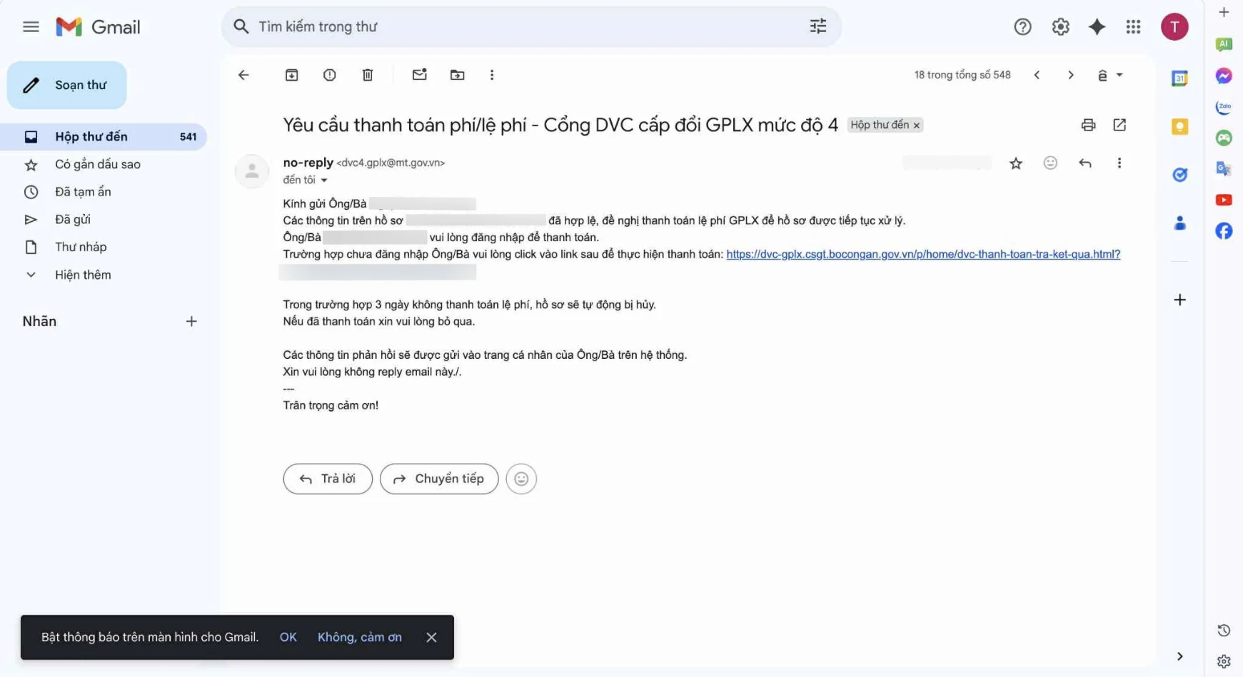Yêu cầu thanh toán phí/lệ phí được gửi về email người thực hiện cấp đổi giấy phép lái xe. Ảnh: Sóng Hữu
