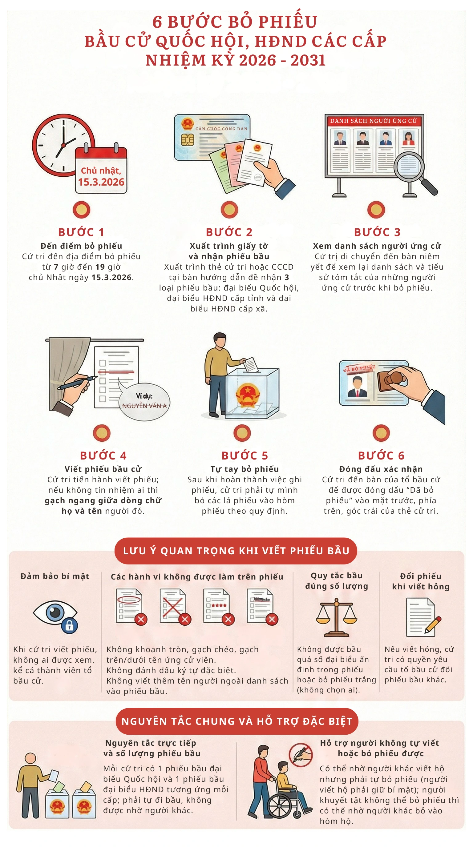 Việc bỏ phiếu bầu cử Quốc hội, HĐND được thực hiện theo 6 bước với các lưu ý cụ thể như sau: