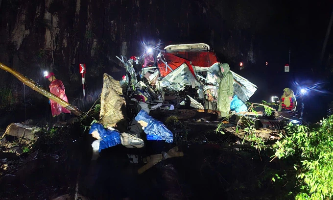 Mưa lớn khiến đèo Khánh Lê ở quốc lộ 27C sạt lở, đất đá vùi lấp xe khách từ Đà Lạt xuống Nha Trang, 6 người tử vong, 19 người bị thương, cứu hộ đang tìm nạn nhân, sáng 17/11.
