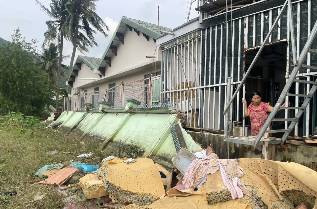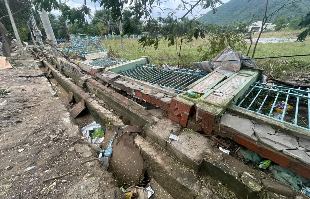 Sau đợt lũ, một công trình tại Nha Trang (Khánh Hòa) bộc lộ hàng loạt bất cập, đặc biệt là việc thi công không gia cố sắt thép khiến hạng mục tường bao sụp đổ.