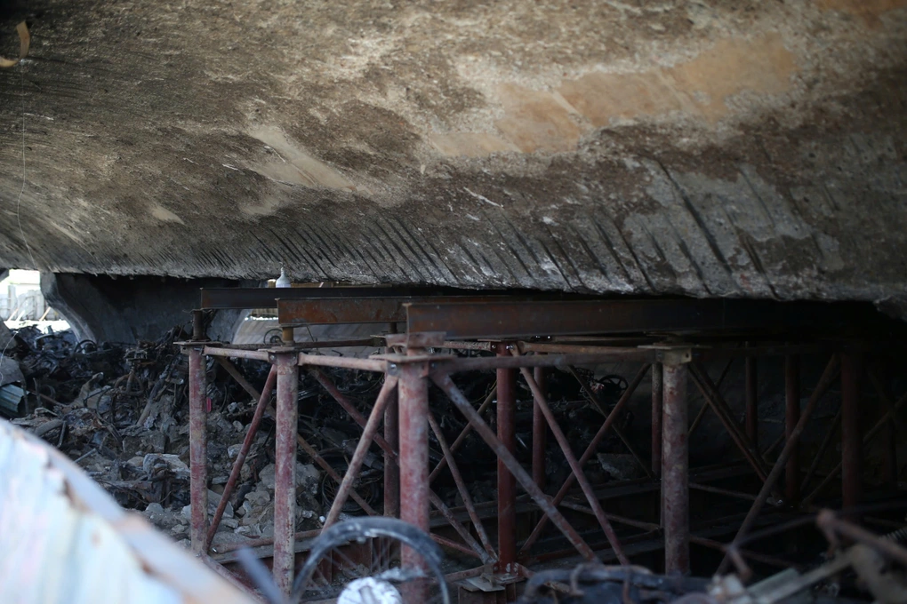 Lực lượng chức năng lắp đặt một trụ sắt tại vị trí dầm bị ảnh hưởng sau vụ cháy gầm cầu Vĩnh Tuy (Ảnh: CTV).