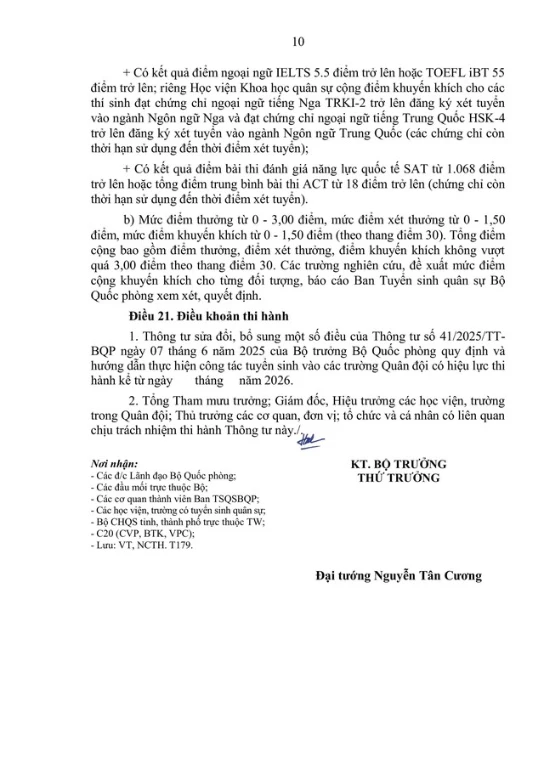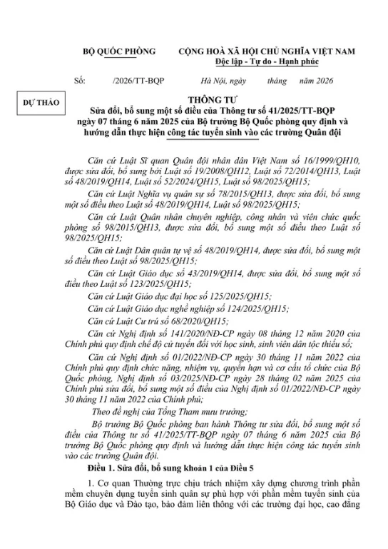 Bộ Quốc phòng lấy ý kiến dự thảo Thông tư sửa đổi, bổ sung một số điều tại Thông tư số 41/2025/TT-BQP ngày 07/6/2025 của Bộ trưởng Bộ Quốc phòng quy định và hướng dẫn thực hiện công tác tuyển sinh vào các trường Quân đội (tuyển sinh quân sự).