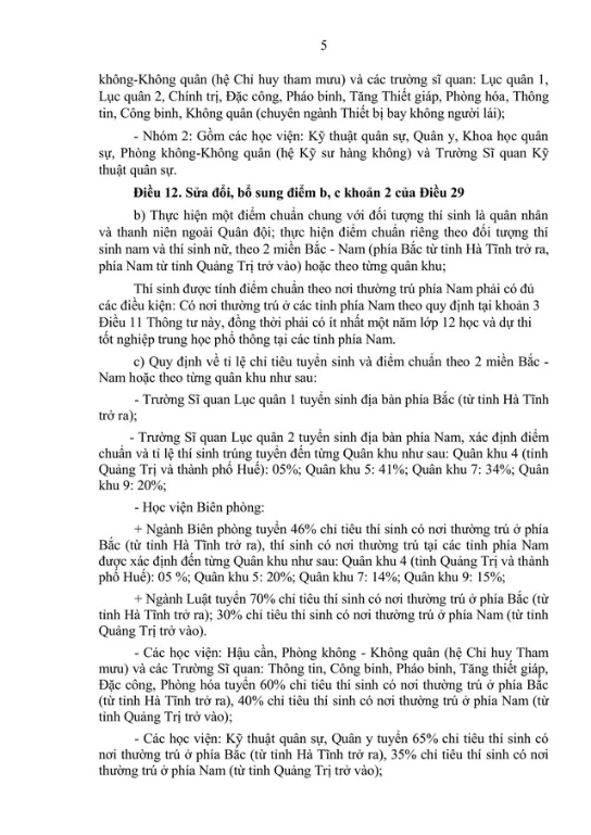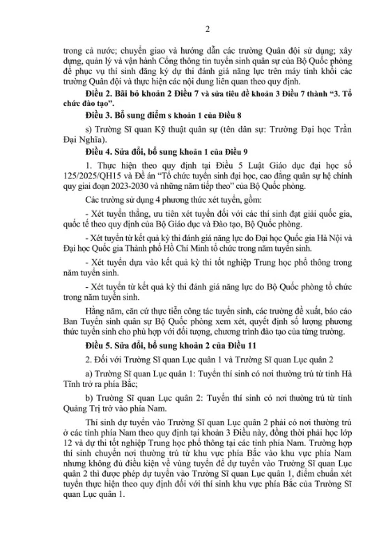 Sửa đổi, bổ sung khoản 2 Điều 11: Quy định khu vực tuyển sinh của Trường Sĩ quan Lục quân 1 từ tỉnh Hà Tĩnh trở ra, Trường Sĩ quan Lục quân 2 từ tỉnh Quảng Trị trở vào.