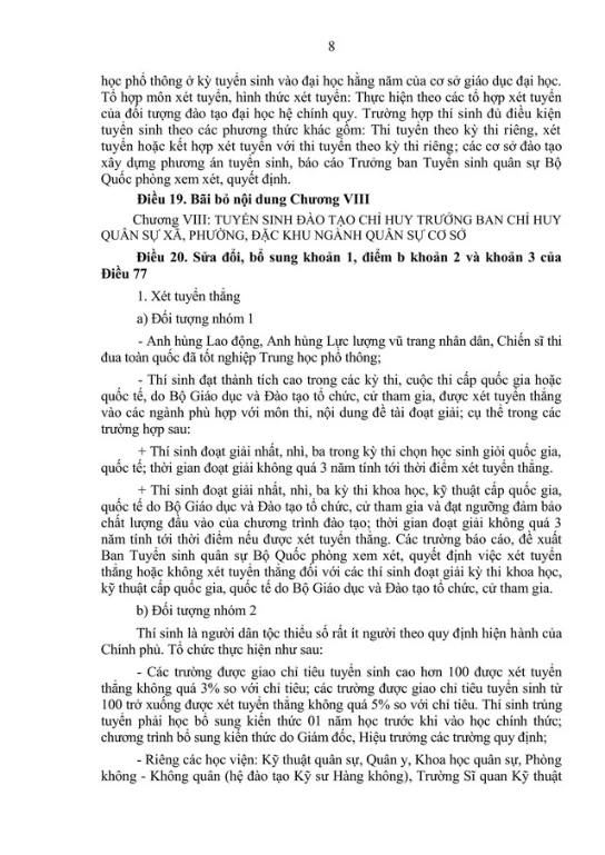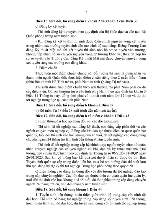 Sửa đổi, bổ sung khoản 1 Điều 44: Bổ sung quy định về phương thức tuyển sinh liên thông từ trình độ trung cấp lên trình độ đại học. Cụ thể, trường hợp thí sinh đủ điều kiện tuyển sinh theo các phương thức khác gồm: Thi tuyển theo kỳ thi riêng, xét tuyển hoặc kết hợp xét tuyển với thi tuyển theo kỳ thi riêng; các cơ sở đào tạo xây dựng phương án tuyển sinh, báo cáo Trưởng ban Tuyển sinh quân sự Bộ Quốc phòng xem xét, quyết định.