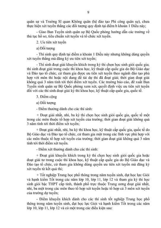 Sửa đổi, bổ sung khoản 1 Điều 9: Bổ sung nội dung các phương thức xét tuyển. Lý do, sửa đổi để phù hợp với quy định của các văn bản: Luật Giáo dục đại học số 125/2025/QH15 thay thế Luật Giáo dục đại học năm 2012 được sửa đổi, bổ sung năm 2018; Đề án "Tổ chức tuyển sinh đại học, cao đẳng quân sự hệ chính quy giai đoạn 2023-2030 và những năm tiếp theo" của Bộ Quốc phòng.