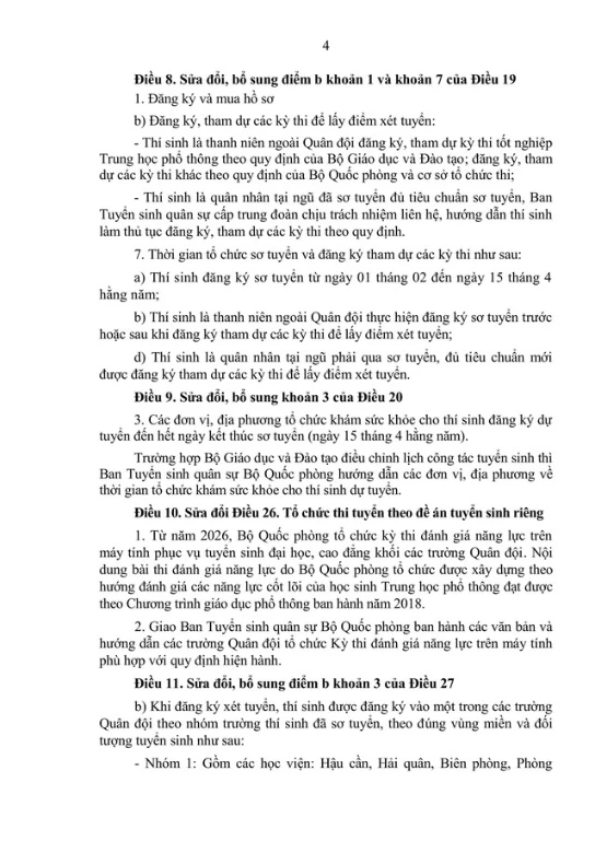 Sửa đổi, bổ sung điểm b khoản 1 và khoản 7 Điều 19: Thay thế cụm từ "tham dự kỳ thi tốt nghiệp Trung học phổ thông" bằng cụm từ "tham dự các kỳ thi để lấy điểm xét tuyển"; quy định thời gian khám sức khỏe từ 01/02 đến 25/4 hằng năm; quy định về việc đăng ký tham dự các kỳ thi để lấy điểm xét tuyển.