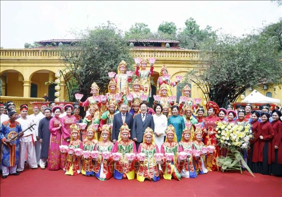Tại Hoàng Thành Thăng Long, chào đón đoàn là tiếng trống hội vang lên mở đầu nghi lễ, gợi nhắc truyền thống lễ nhạc cung đình vốn là biểu tượng của sự trang nghiêm và thịnh vượng, với tiết mục múa lân truyền thống mang ý nghĩa cầu chúc may mắn, biểu trưng cho hòa bình và thịnh trị, thường xuất hiện trong các dịp lễ trọng đại của quốc gia.