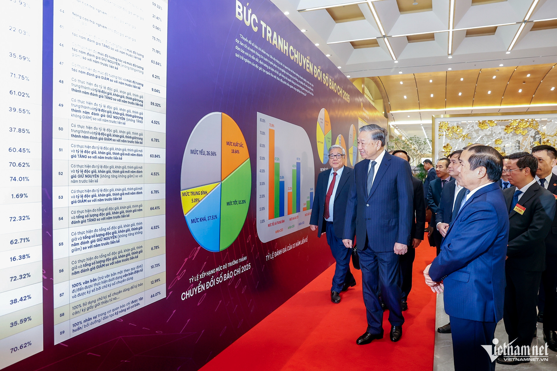 Trước giờ khai mạc hội nghị, các lãnh đạo Đảng, Nhà nước cùng đông đảo đại biểu đã tham quan không gian trưng bày sách, triển lãm ảnh và thành tựu chuyển đổi số trong báo chí tại Trung tâm triển lãm quốc gia Đông Anh, Hà Nội.