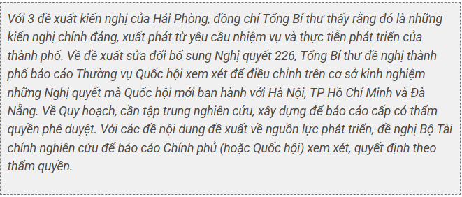 Đề nghị Trung ương sớm phê duyệt điều chỉnh Quy hoạch vùng Đồng bằng sông Hồng và các quy hoạch ngành quốc gia, trong đó xem xét cập nhật các đề xuất của TP Hải Phòng nhằm đáp ứng mục tiêu phát triển thành phố; Đề nghị Trung ương cấp vốn cho một số dự án chiến lược trên địa bàn, đồng thời kiến nghị cho phép sửa đổi Nghị quyết 226 về cơ chế đặc thù cho thành phố để bổ sung một số cơ chế, chính sách mà thủ đô Hà Nội, TP Hồ Chí Minh vừa được áp dụng, nhằm tháo gỡ các điểm nghẽn về thể chế và tạo động lực phát triển mới cho thành phố…