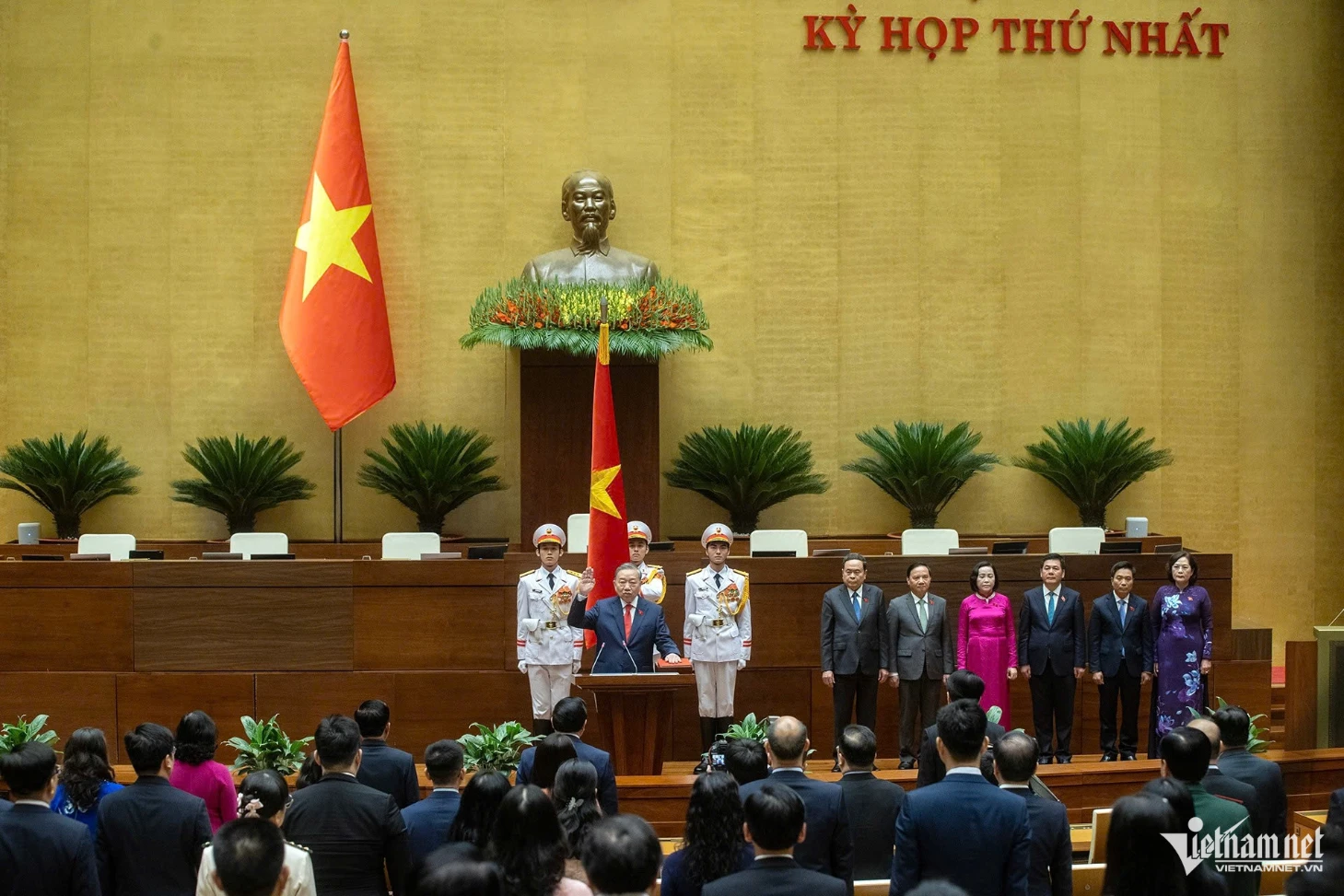 "Dưới cờ đỏ sao vàng thiêng liêng của Tổ quốc, trước Quốc hội, đồng bào và cử tri, tôi - Chủ tịch nước Cộng hòa xã hội chủ nghĩa Việt Nam, xin tuyên thệ: Tuyệt đối trung thành với Tổ quốc, với nhân dân, với Hiến pháp nước Cộng hòa xã hội chủ nghĩa Việt Nam, nỗ lực, phấn đấu, hoàn thành tốt mọi nhiệm vụ mà Đảng, Nhà nước và Nhân dân giao phó", Tổng Bí thư, Chủ tịch nước Tô Lâm tuyên thệ.