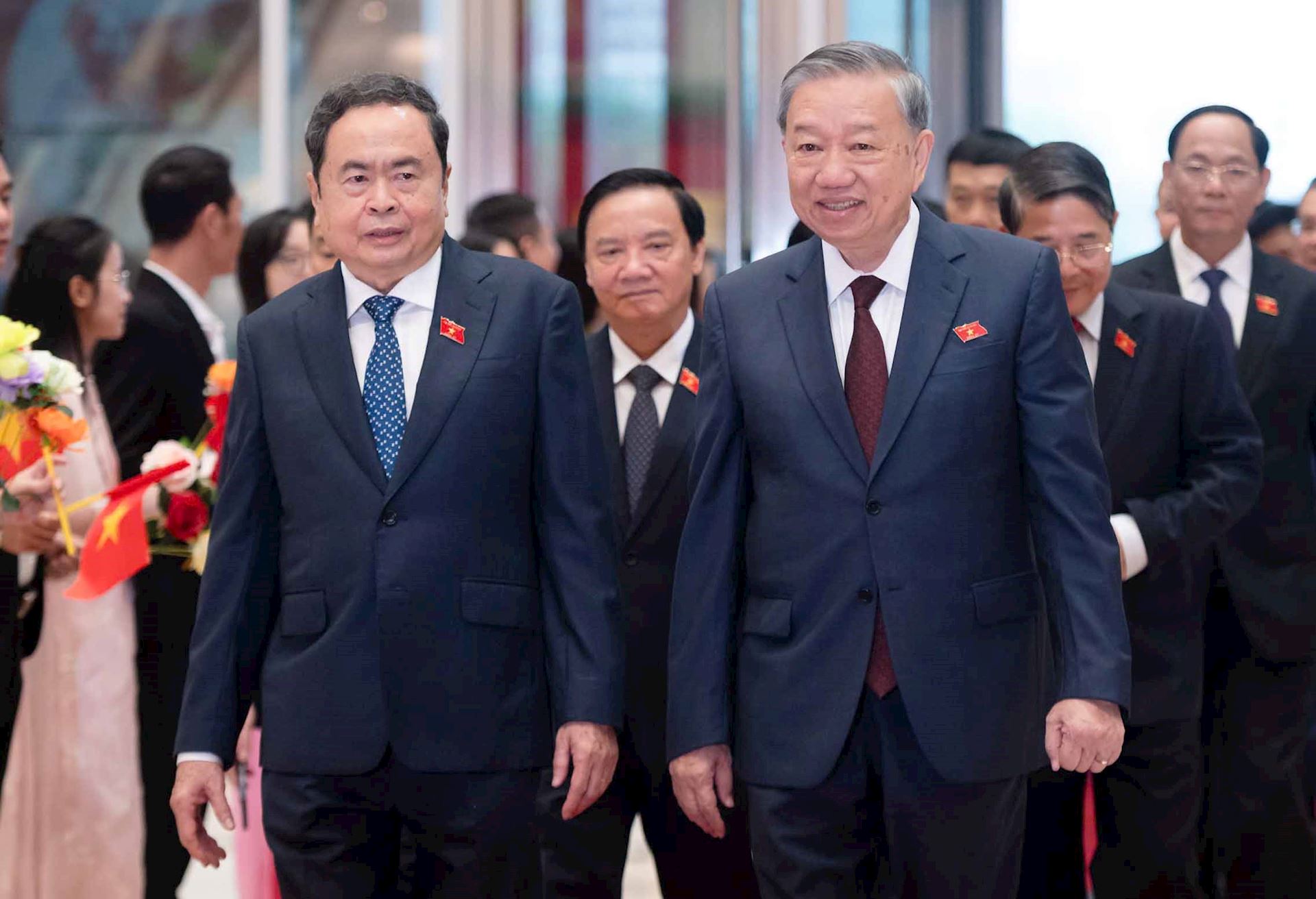 Tổng Bí thư Tô Lâm và Chủ tịch Quốc hội Trần Thanh Mẫn cùng lãnh đạo, nguyên lãnh đạo Đảng, Nhà nước, Mặt trận Tổ quốc Việt Nam cùng các đại biểu dự cuộc gặp mặt. Ảnh: Phạm Thắng.