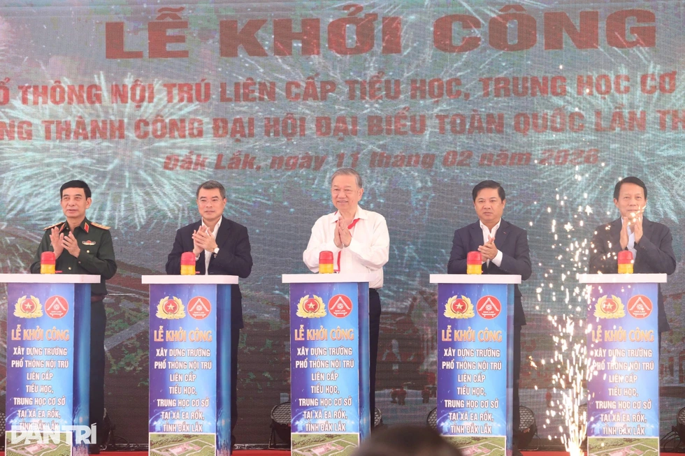 Tổng Bí thư Tô Lâm cùng các đại biểu nhấn nút khởi công dự án trường nội trú liên cấp tại Đắk Lắk (Ảnh: Thúy Diễm).