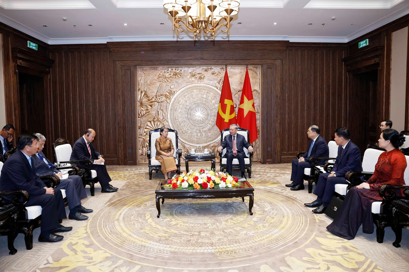 Tổng Bí thư Tô Lâm tiếp bà Men Sam An, Phó Chủ tịch CPP, Chủ tịch Hội đồng Quốc gia Mặt trận Đoàn kết Phát triển Tổ quốc Campuchia. Ảnh: TTXVN