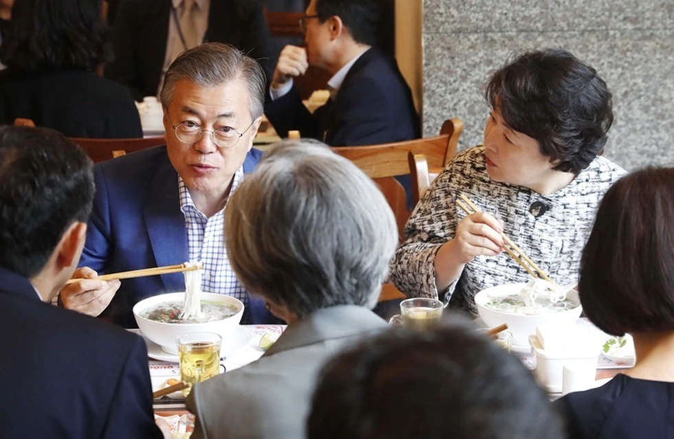 Cựu Tổng thống Hàn Quốc Moon Jae-in và Phu nhân ăn phở tại quán trên phố Hoàng Minh Giám năm 2018 (Ảnh: Joongboo)