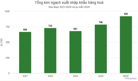 Tại phiên họp Chính phủ ngày 6/12, Bộ trưởng Công Thương Nguyễn Hồng Diên cho rằng với đà tăng trưởng hiện nay, xuất nhập khẩu cả năm 2025 có thể đạt 920 tỷ USD hoặc cao hơn. Qua đó, Việt Nam sẽ nằm trong nhóm 15 quốc gia có quy mô thương mại lớn nhất thế giới.